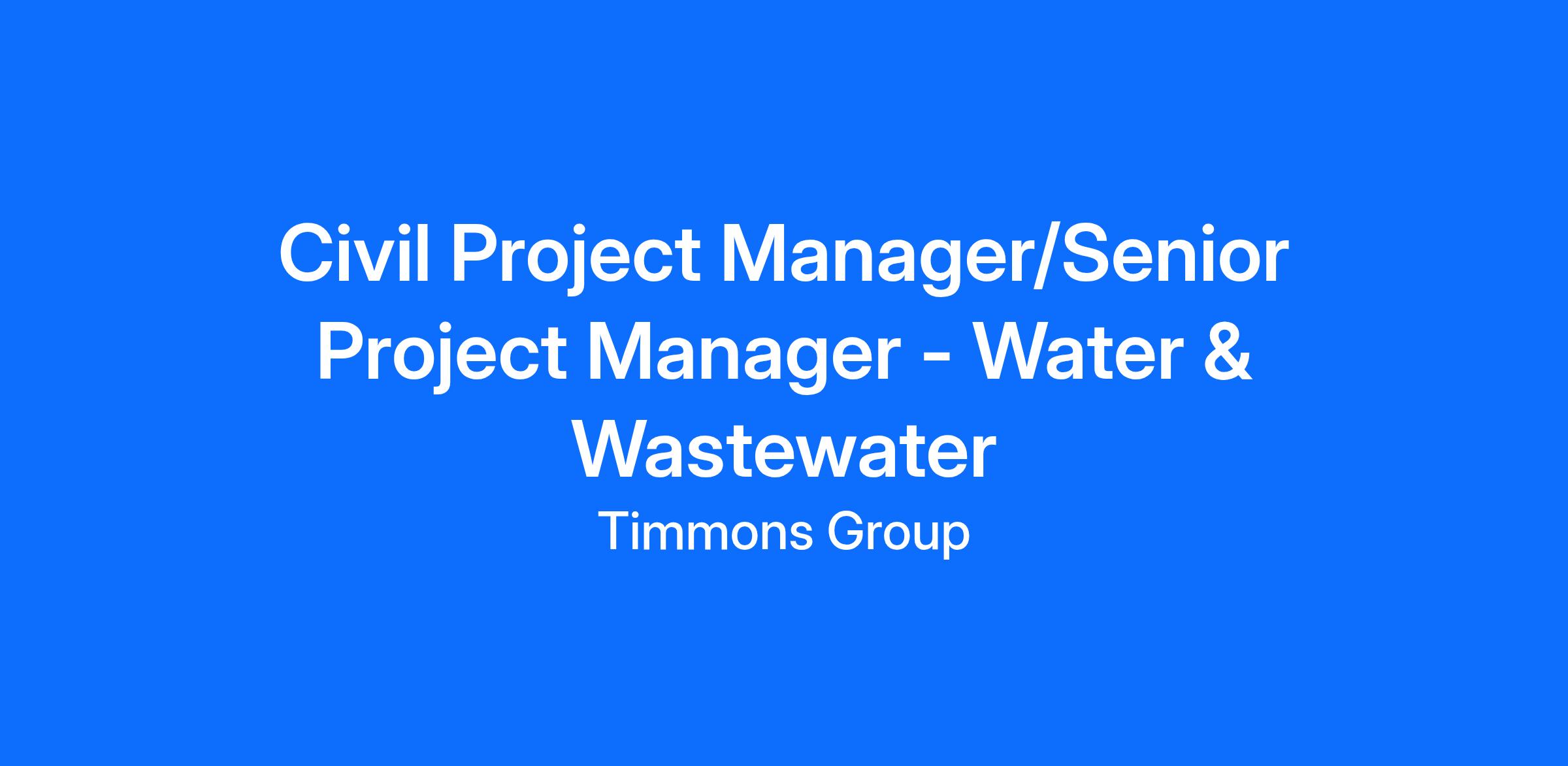 Timmons Group is currently seeking a Civil Project Manager/Senior Project Manager - Water & Wastewater candidate to join our Water & Wastewater Group located in our Richmond, VA office location.