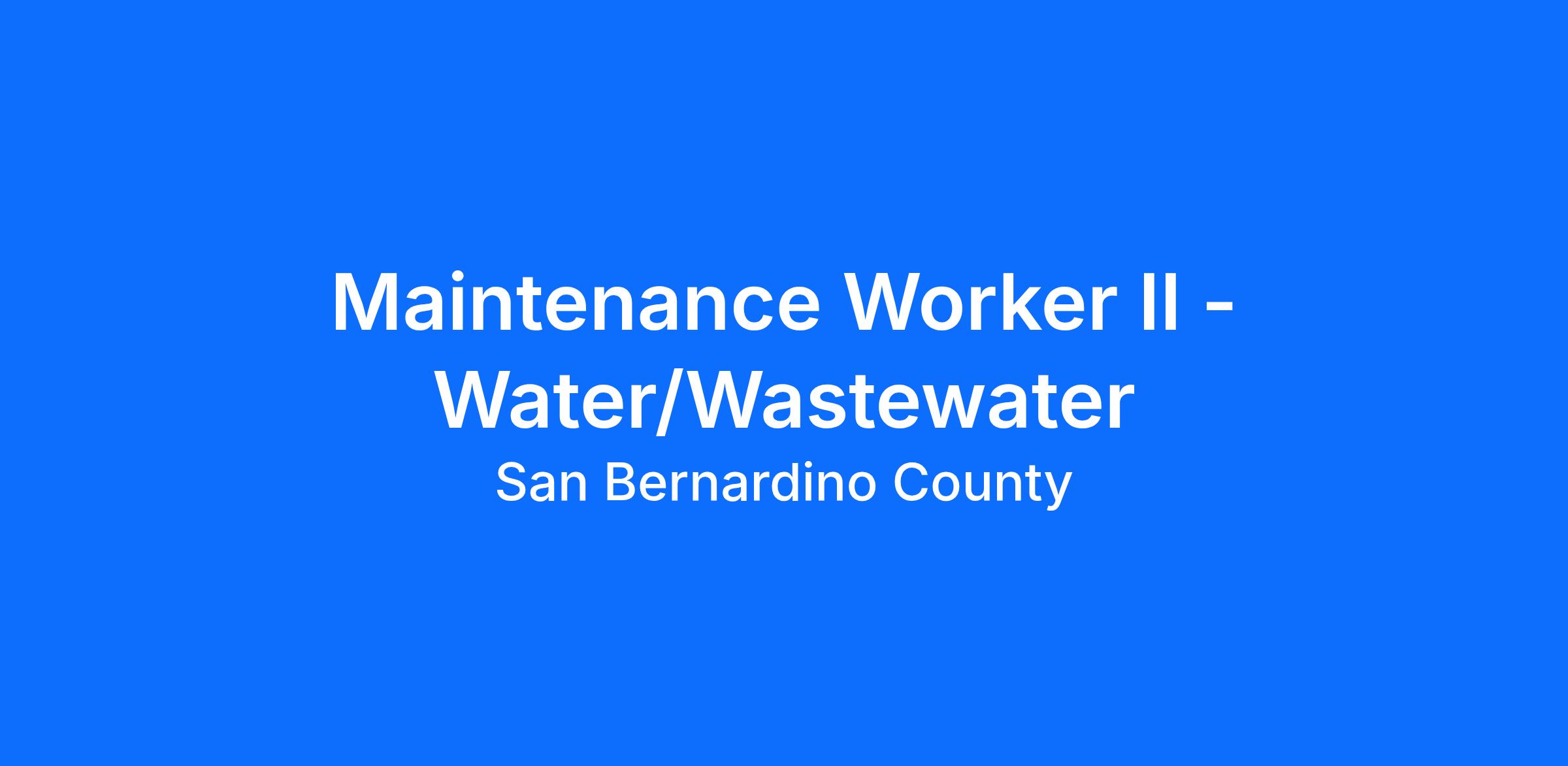 San Bernardino County's Department of Public Works, Special Districts, Water and Sanitation Division is recruiting for Maintenance Workers II to perform a variety of general and semi-skilled maintenance tasks pertaining to the operation of a water distribution or wastewater collection system. Maintenance Workers are required to perform their duties in all weather conditions, and at any work site; work sites are located throughout the County, including high/low deserts, mountains, and valleys. For more detailed information refer to the Maintenance Worker II job description.