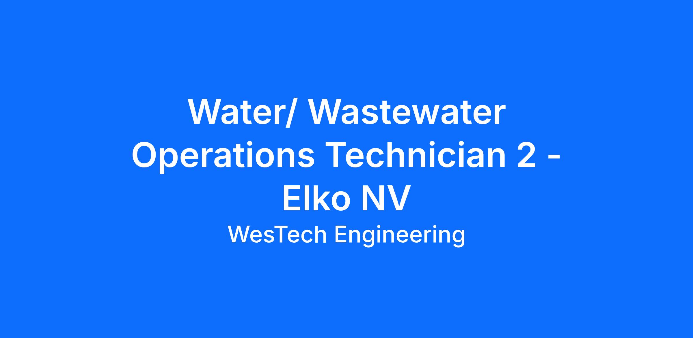 Summary: Are you self-motivated, reliable, and willing to learn? We have an immediate need for a Water/Wastewater Operations Technician located in Elko, Nevada. This role is responsible for the daily operations of a water treatment plant with responsibilities that include water treatment, reverse osmosis, ultra filtration, filters, and chemical treatment processes.